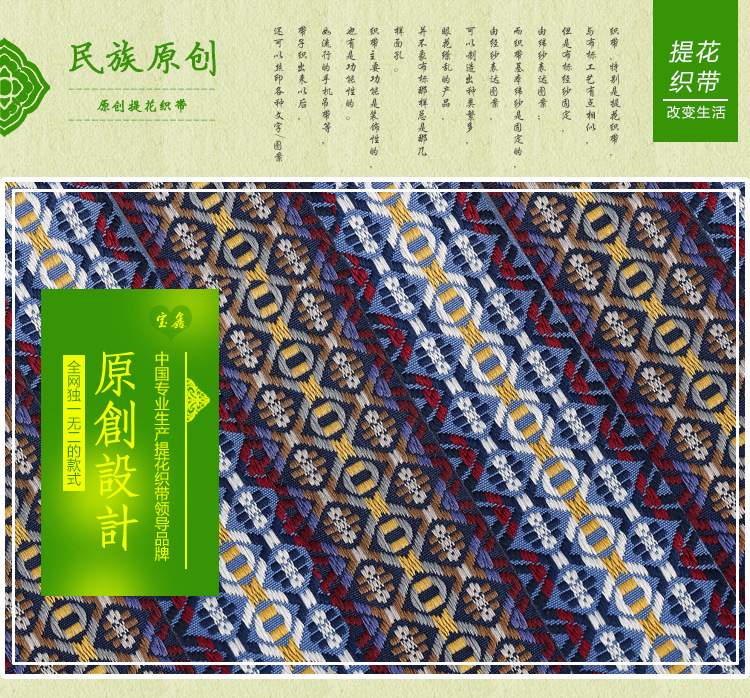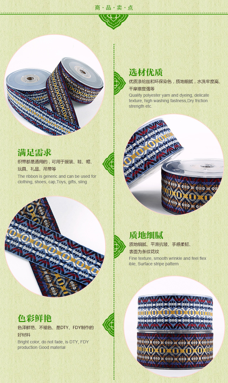 主營產(chǎn)品:提花織帶,韓國織帶,編織帶,仿尼龍織帶,緞帶/羅紋帶,子母織帶,熱轉(zhuǎn)印織帶,間色織帶