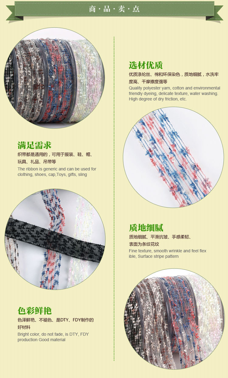 主營產品:提花織帶,韓國織帶,編織帶,仿尼龍織帶,緞帶/羅紋帶,子母織帶,熱轉印織帶,間色織帶