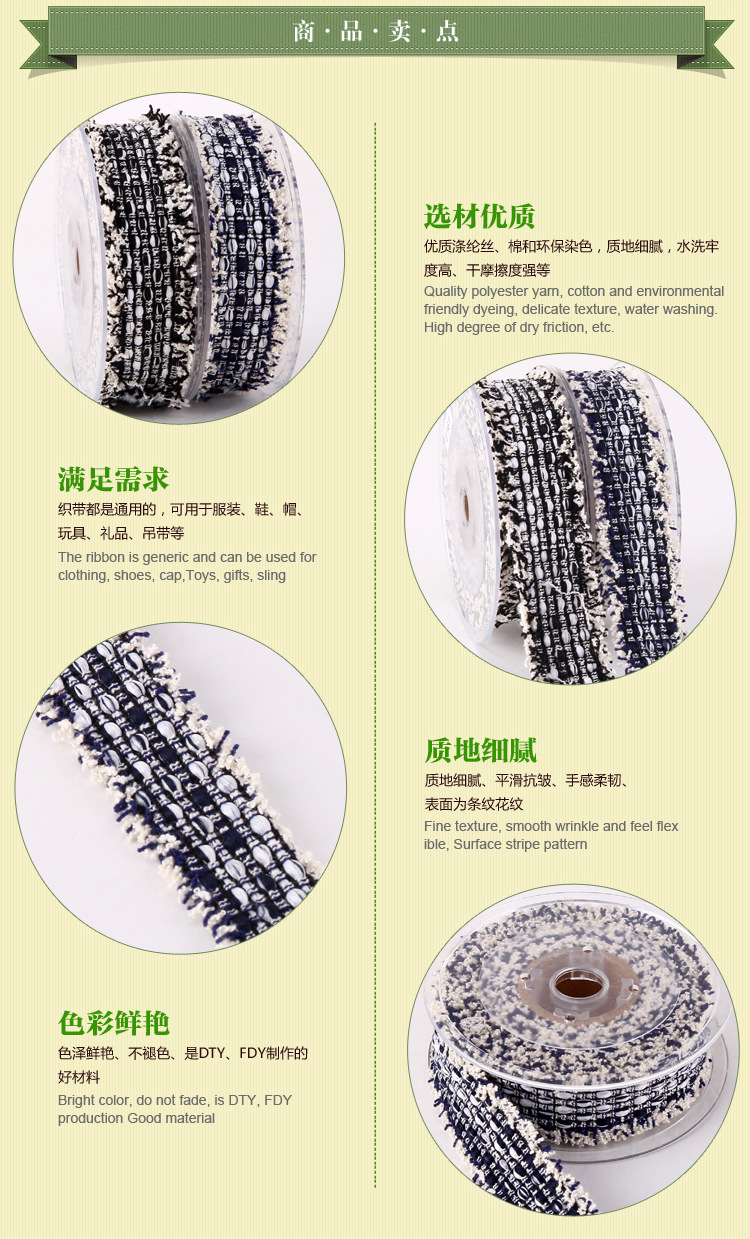 主營(yíng)產(chǎn)品:提花織帶,韓國(guó)織帶,編織帶,仿尼龍織帶,緞帶/羅紋帶,子母織帶,熱轉(zhuǎn)印織帶,間色織帶