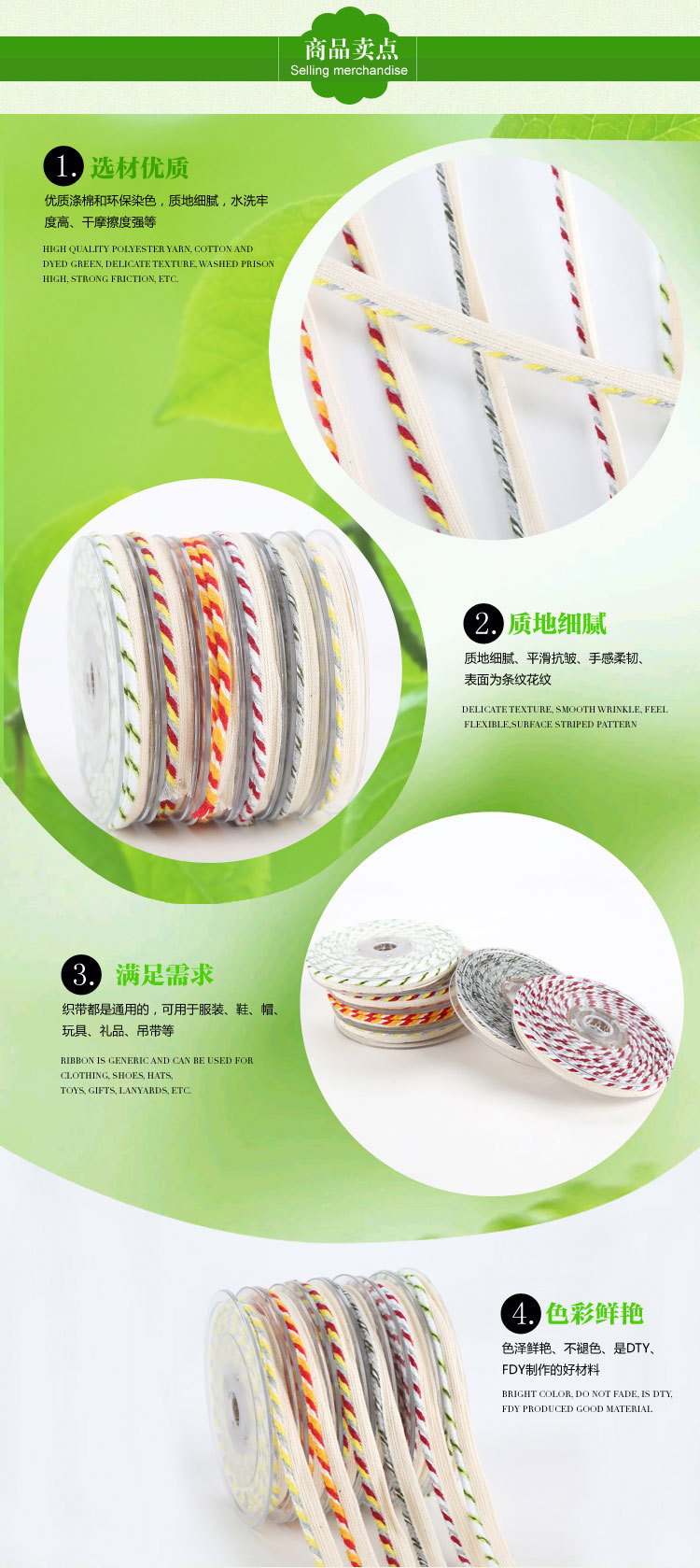主營產品:提花織帶,韓國織帶,編織帶,仿尼龍織帶,緞帶/羅紋帶,子母織帶,熱轉印織帶,間色織帶