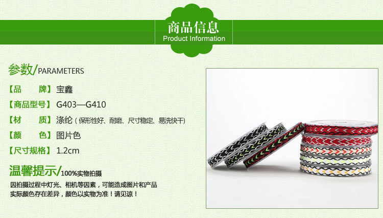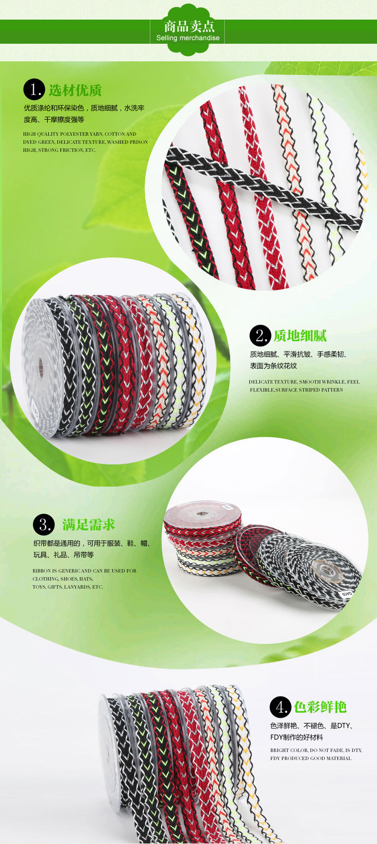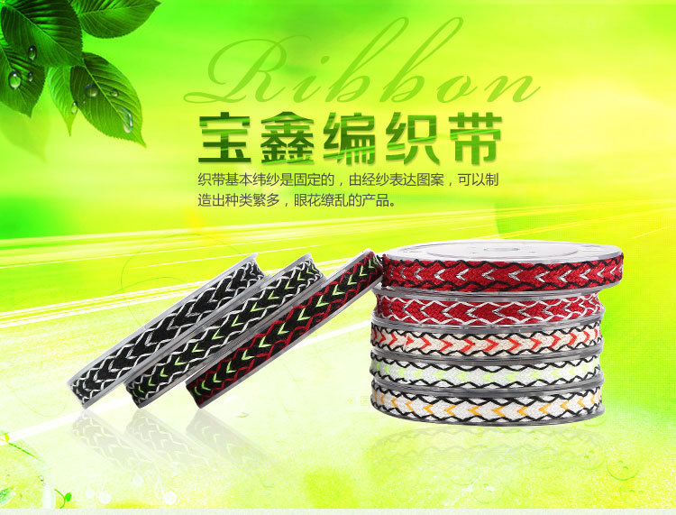 主營產(chǎn)品:提花織帶,韓國織帶,編織帶,仿尼龍織帶,緞帶/羅紋帶,子母織帶,熱轉(zhuǎn)印織帶,間色織帶